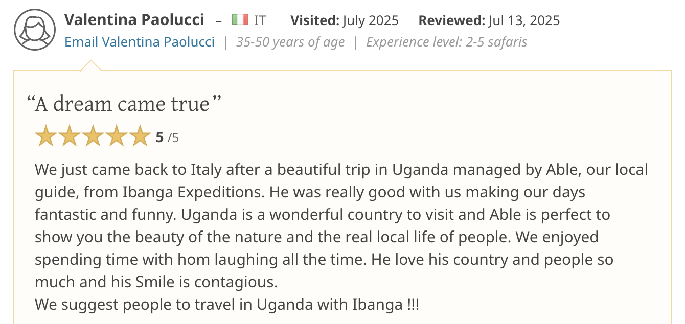 Very nice combination of activities in this tour. Able has a lot to tell and is a real ambassador of Uganda. He is really caring for the joy of his guests.